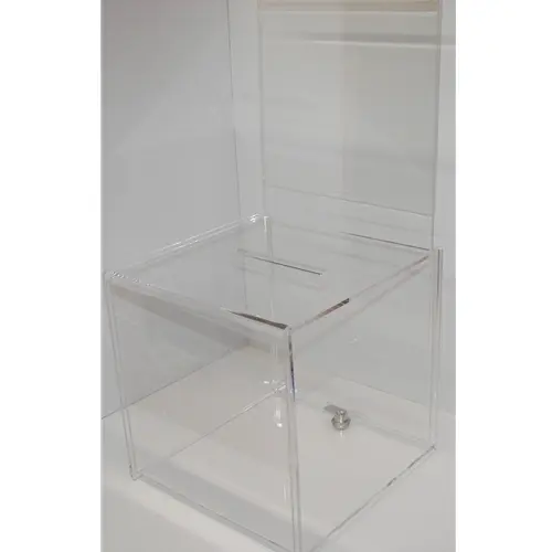 The outside dimensions of this box are 10″ x 10″ x 10″. These boxes come with a lever lock. The sign holder back can be replaced by a 3/16″ thick sliding back upon request.