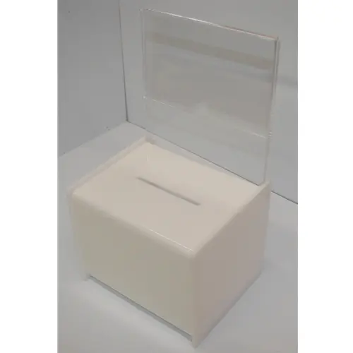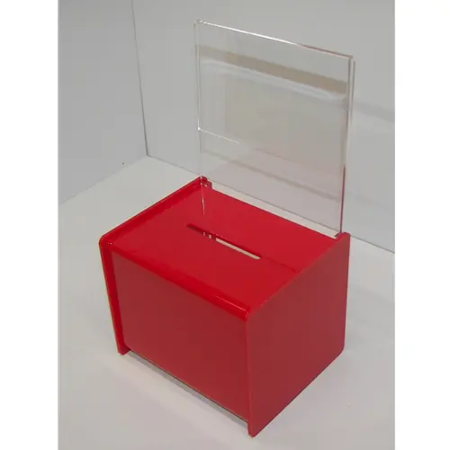 The inside dimensions are 5.625″ wide x 4.25″ deep x 4″ high. These boxes come with a lever lock. The sign holder back can be replaced by a 1/8″ thick sliding back upon request.